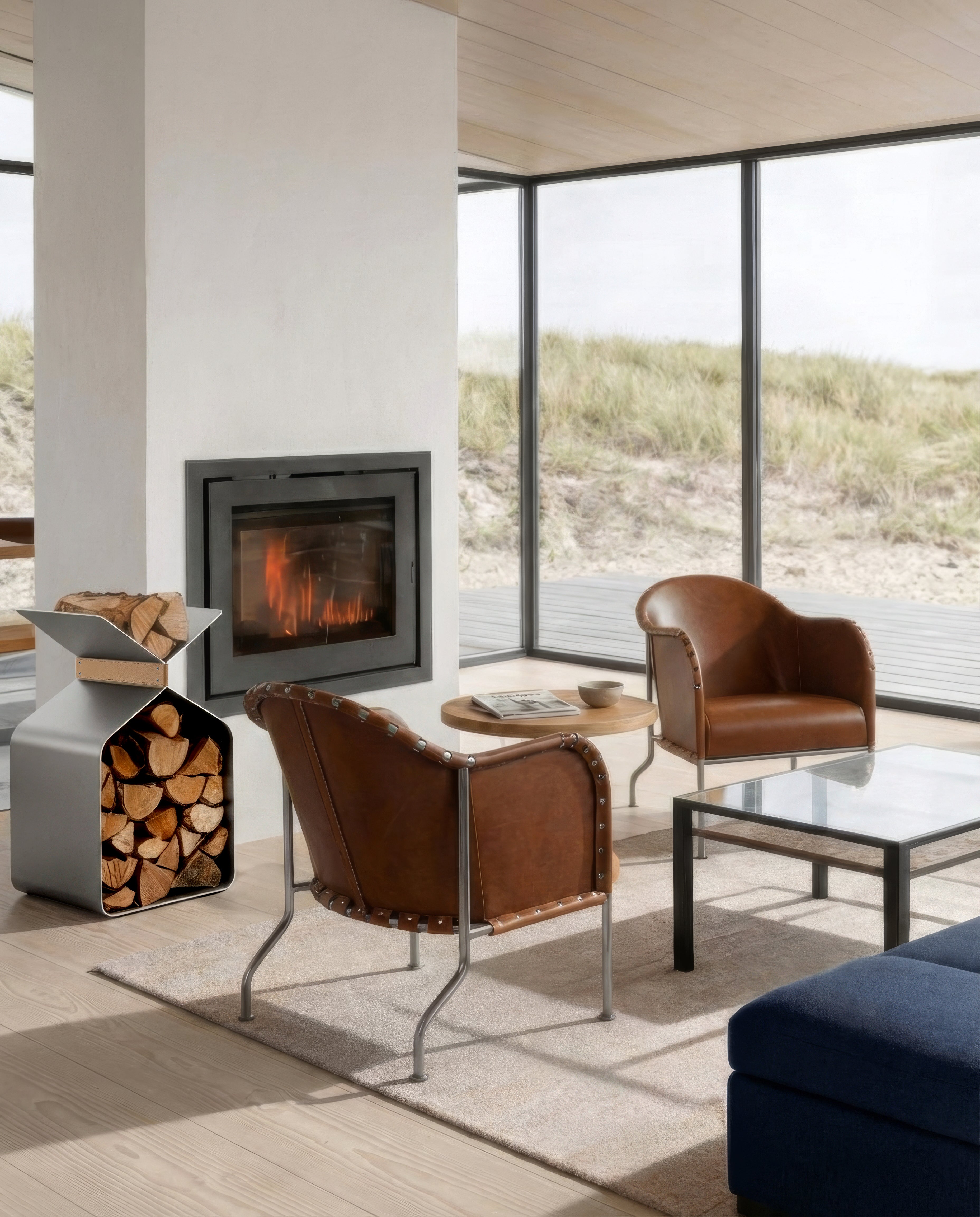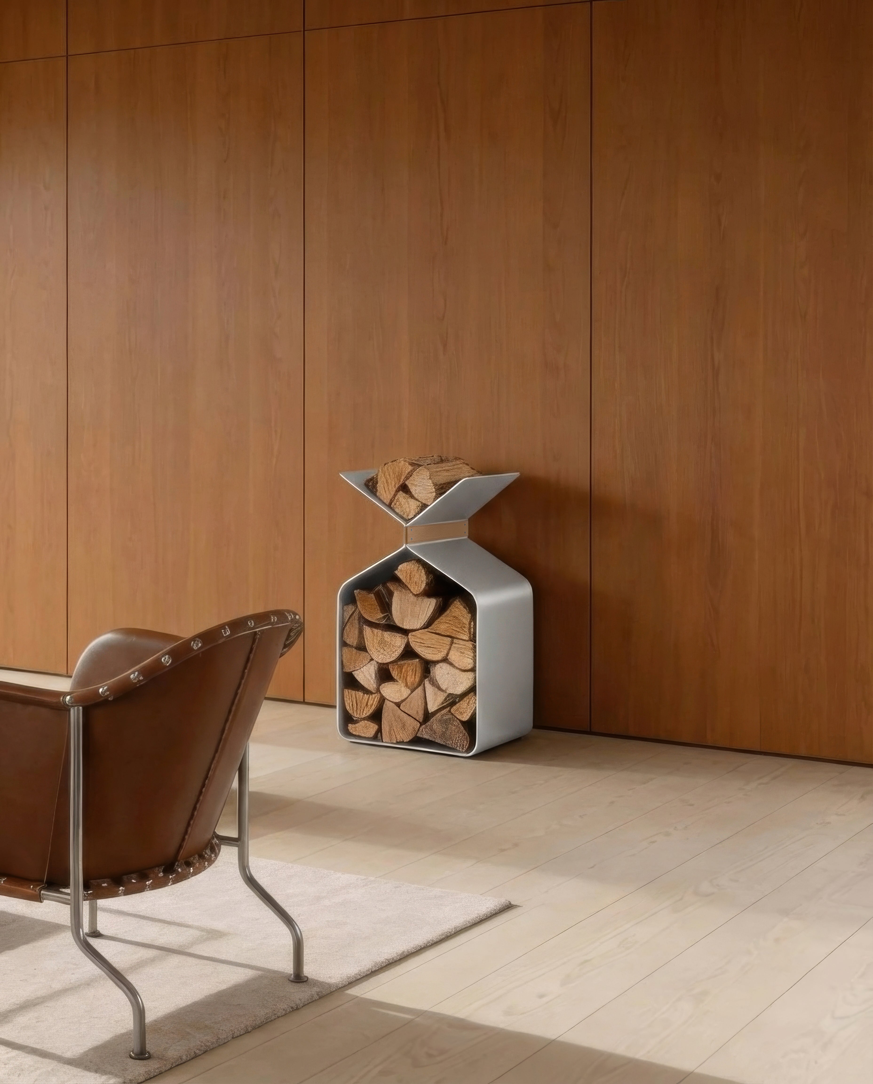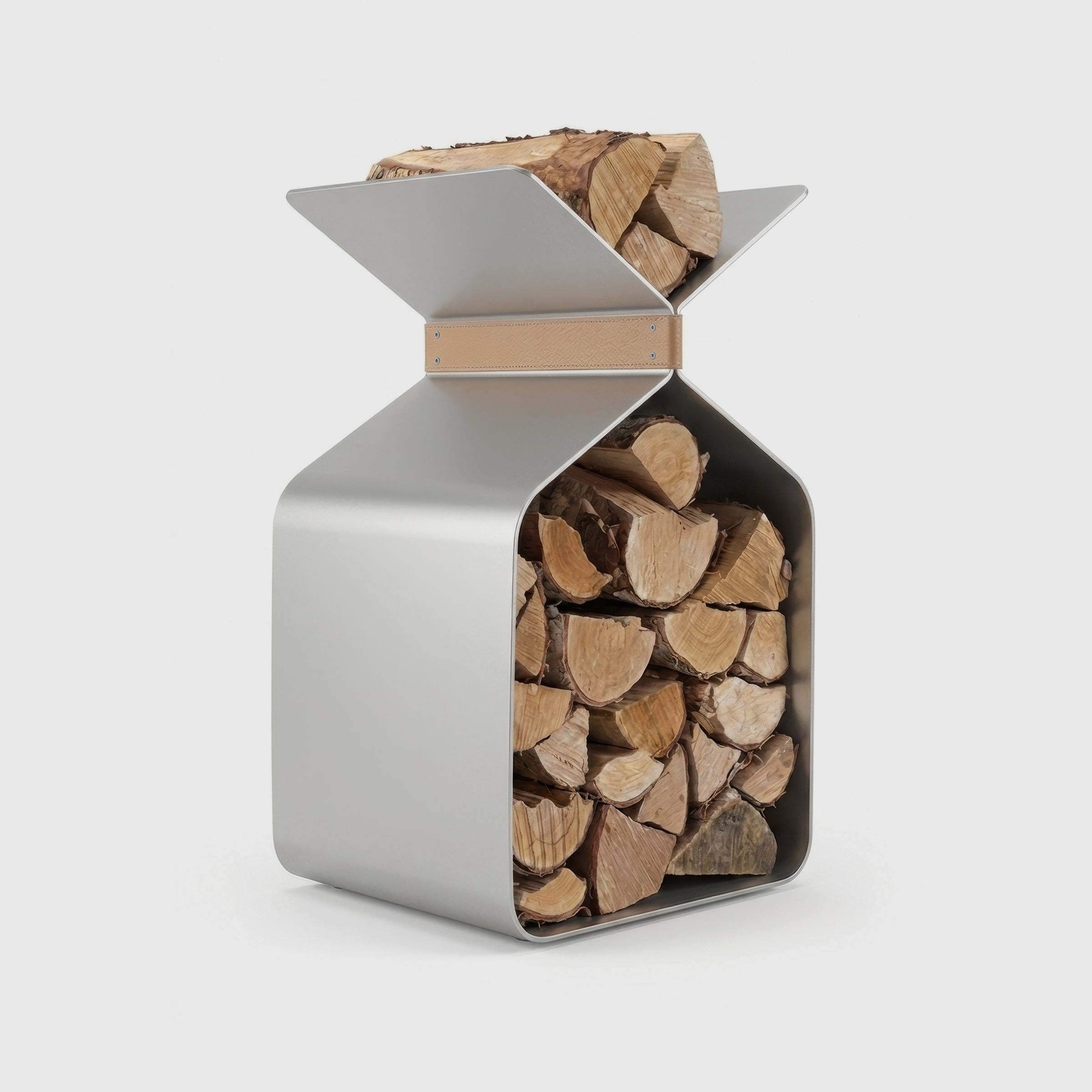 Gefertigt aus satinierter Aluminiumoberfläche vereint der Ständer Funktion und skulpturale Form. Die Holzscheite bleiben geordnet, während das Objekt selbst zu einer stillen, aber klaren Präsenz im Raum wird.