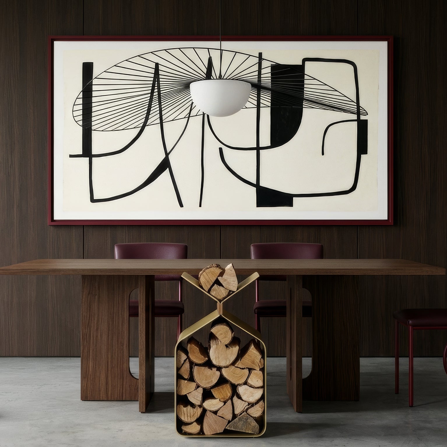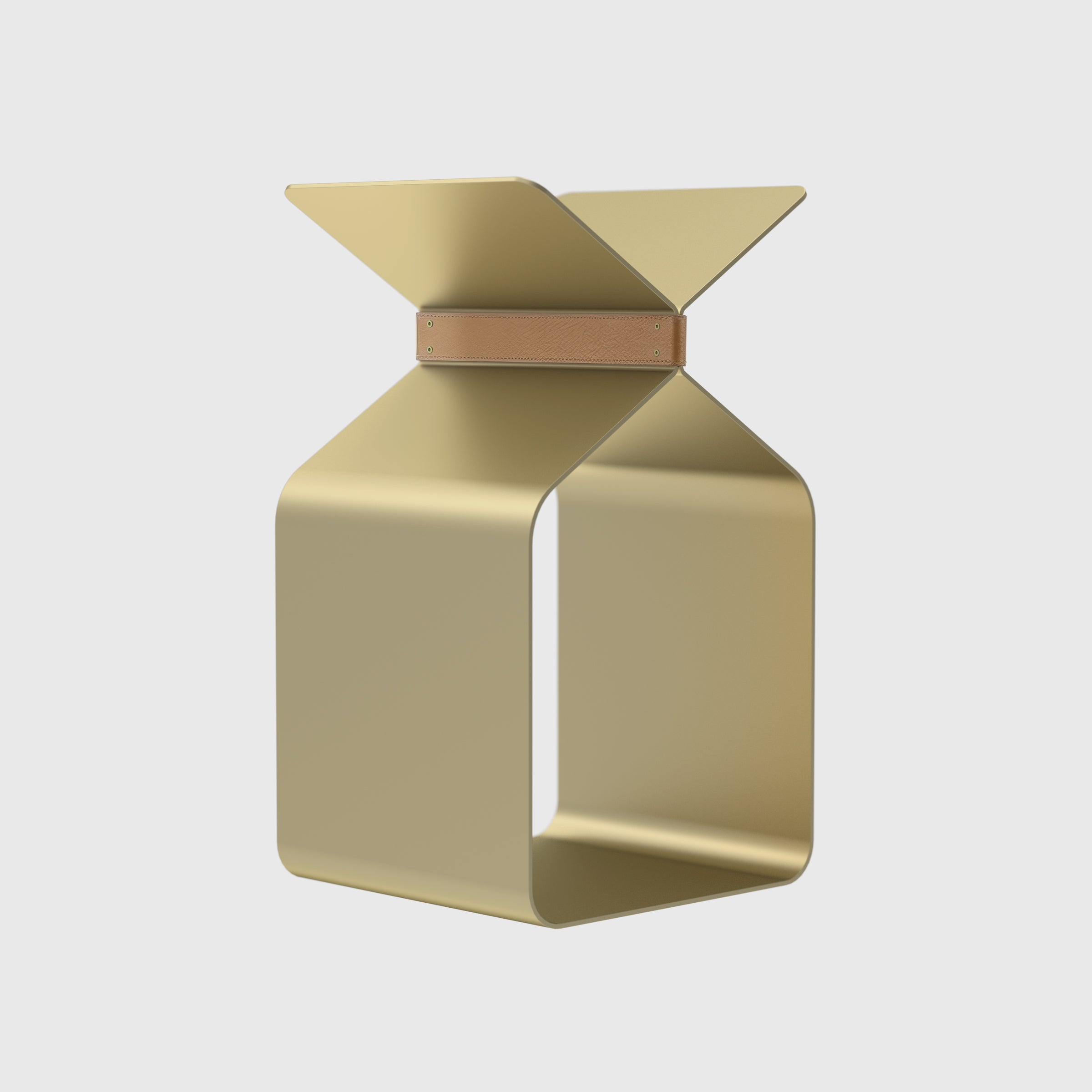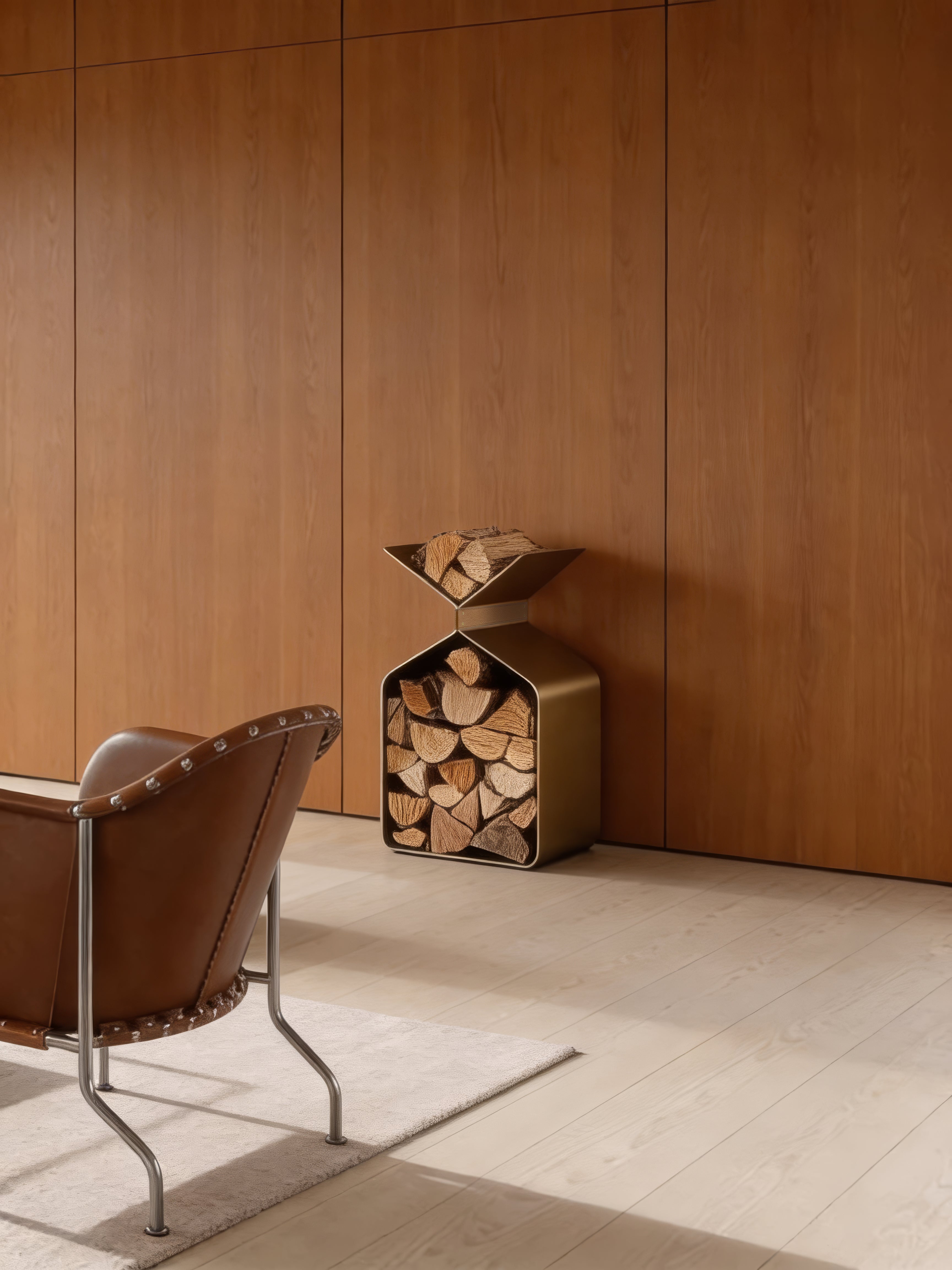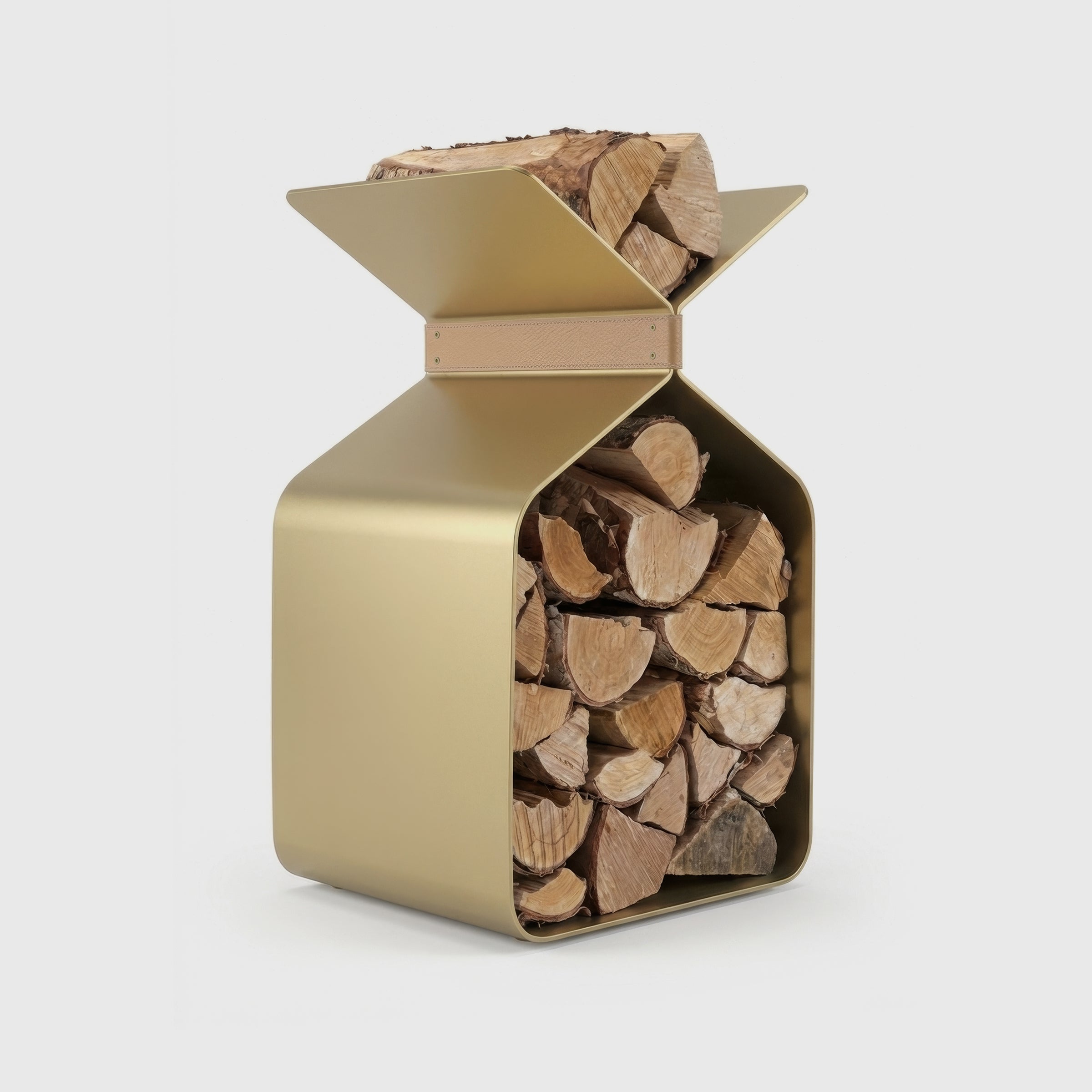 Utfört i satinpolerad mässing förenar stället funktion och skulptural form. Vedträna hålls ordnade, medan föremålet i sig blir en stillsam men tydlig närvaro i rummet.
